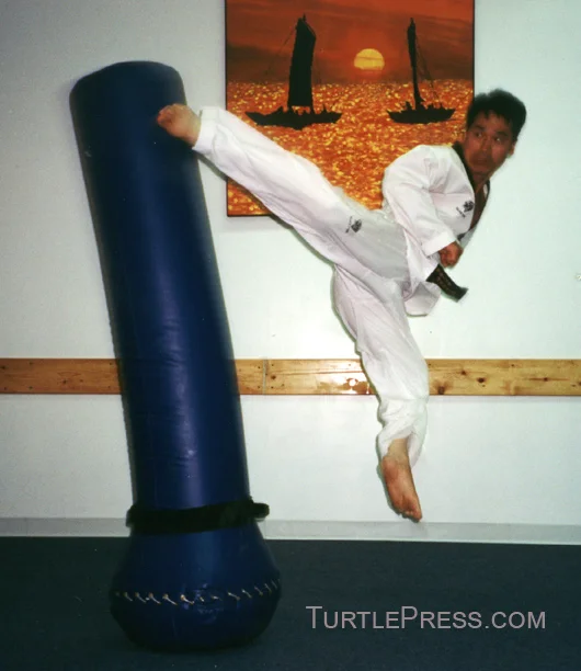 To achieve this, you have to first rotate your hips, then begin your turn step. When your stepping foot has completed its turn, it should be about eight inches above the ground. At this point, your kicking leg should be on its way to the target. A jumping turn kick is nearly twice as powerful as a standard turn kick because the aero step forces your entire body weight into the target. In a standard turn kick, your body weight is resting primarily on your standing foot. In a jumping turn kick, both feet are in the air and your body weight is literally spinning through the air into your target.